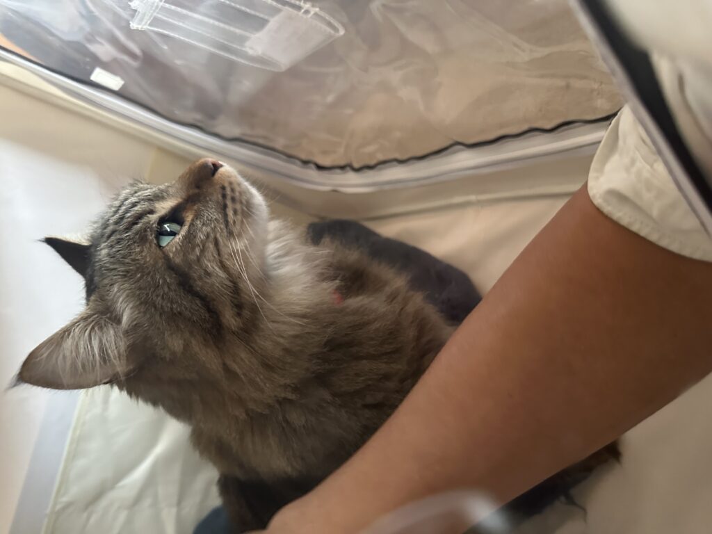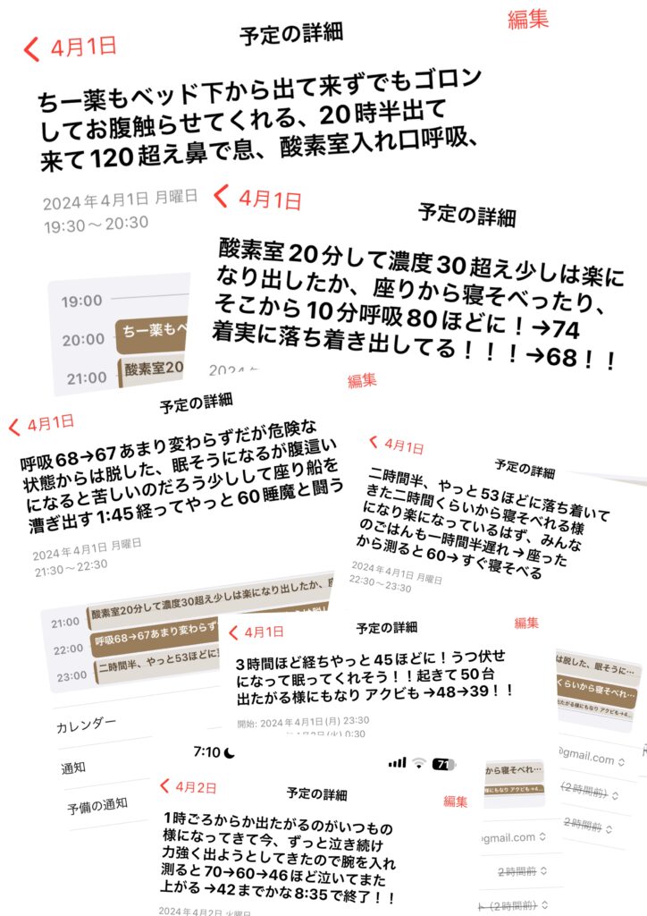抱き上げるのも怖かったのですが、すぐに酸素室へ強制で入れ、それから朝まで、ずっと横についていました。